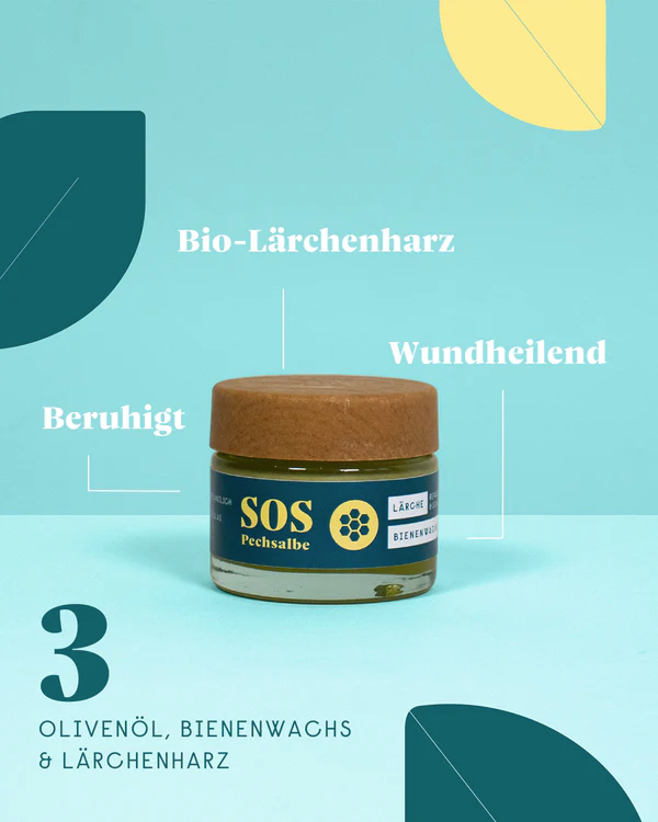 Unsere SOS-Pechsalbe mit hochkonzentriertem Lärchenharz ist das traditionelle Heilmittel für jede Haus- und Reiseapotheke. Sie unterstützt die Heilung von kleinen Schnittwunden und Schürfwunden, regeneriert trockene, spröde oder rissige Haut und unterstützt das Aufweichen und pflegen von Hornhaut und Schwielen. Aufgrund der durchblutungsfördernden Eigenschaften kann die Salbe zudem bei Muskel- und Gelenkschmerzen eingesetzt werden. Frei von Wasser und synthetischen Zusatzstoffen, enthält die Salbe ausschließlich die Wirkstoffe Bienenwachs und Olivenöl, die die Haut nachhaltig pflegen und beruhigen.