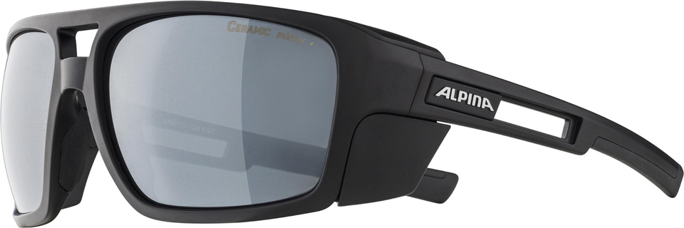 Die neue Gletscherbrille von ALPINA: SKYWALSH. Modern im Design, maximal im Schutz. Das Glas mit Schutzstufe 4 sowie die seitlichen Abdeckungen machen die ALPINA SKYWALSH zu einer Gletscherbrille ohne Kompromisse. Nur der Gipfel ist das Limit. Die ALPINA SKYWALSH ist mit einer Ceramic-Scheibe ausgestattet, die 100% Schutz vor UV-Strahlen bietet und mit der Schutzstufe 4 auch die Gletschernorm erreicht. Klappen an den Bügeln verhindern, dass Streulicht von der Seite einfallen kann – ein zwingend notwendiger Schutz im Hochgebirge und auf Gletschern, um das Auge vor Schädigungen zu bewahren. Für den guten Sitz und hohen Tragekonform der Gletscherbrille sorgt das 2-Komponenten-Design. Die harte Fassung ist robust und verleiht der ALPINA SKYWALSH Stabilität, die weichen, gummierten Bügelenden sowie Nasenpads machen es angenehm, die Brille zu tragen.