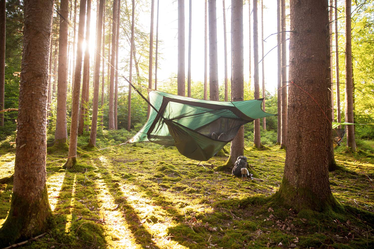 All-in-one Set-Up Das Traveller Camp besteht aus einer ultraleichten Hängematte, die über ein extragroßes Moskitonetz fest mit einem Tarp verbunden ist. So hast du Schlafplatz, Moskitonetz und Schutz vor Wind und Regen in einem. Einfacher Aufbau mit wenigen Handgriffen Die Hängematte zwischen zwei Bäumen spannen - dank den weißen Pfeilen auf den Hängemattenaufhängungen siehst du sofort, wo die Hängematte an gängigen Baumbefestigungen festgemacht werden soll - dann die bereits vormontierte Ridgeline spannen und nach Bedarf die Höhe der Hängematte regulieren. Anschließend noch die vier Ecken des Tarp mithilfe der mitgelieferten Seile und Heringe am Boden fixieren. Die Ridgeline, das Seil, dass das Tarp hält, ist bereits vormontiert. Du kannst sie mithilfe eines Spezialkarabiners bequem und stufenlos verstellen um das Tarp zu spannen. Diagonales Einschubfach für alle typischen Trekking-Isomatten Um dich vor der Kälte von unten zu schützen, blieb dir bisher nur die Möglichkeit eine Isomatte in die Hängematte zu legen. Mit dem Ergebnis, dass die Matte während der Nacht verrutschte und es dann von unten empfindlich kalt wurde. Deswegen haben wir die Thermo-Hängematten entwickelt. Diese haben an der Unterseite ein praktisches Einschubfach mit verstärkten Nähten für eine Isomatte. Damit schläfst du auch an kälteren Tagen warm und sicher in deiner Outdoor-Hängematte. In das Einschubfach passen alle „typischen“ Isomatten, die für Trekking Touren verwendet werden (Regular: ca. 183 x 51 cm; Large: ca. 198 x 65 cm). 'Luxus-Isomatten' mit einer Dicke bis 7 cm passen auch in das Einschubfach. Sie sind zwar relativ groß, können aber, weil es bequemer ist, immer etwas "under inflated" verwendet werden. So passen sie sich besser dem Körper an und der Liegekomfort ist höher. Extragroßes Moskitonetz ohne Spreizstäbe Durch das bereits angenähte Moskitonetz bietet die Hängematte einen großen Innenraum, ganz ohne Aufspannen. So entsteht das Gefühl eines angenehm geschützten Raums. Die Ridgeline, die im Inneren des Netzes verläuft, bietet dir die Möglichkeit, einen Organizer oder kleine Gegenstände in greifbarer Nähe zu verstauen. Auch ohne Hängematte als Tarp oder Bodenzelt nutzbar Das Traveller Camp kann auch als Tarp verwendet werden. Hierzu ziehst du die Hängematte ganz einfach mit den verstellbaren Gurten nach oben und verstaust sie direkt unterhalb des Tarps. So entsteht darunter z. B. ein Aufenthaltsplatz bei Regen. Sollten dir keine zwei Bäume im richtigen Abstand zur Verfügung stehen, kannst du das Traveller Camp auch am Boden nutzen. Dazu spannst du die Aufhängepunkte mithilfe von langen Ästen oder von Wanderstöcken ab.
