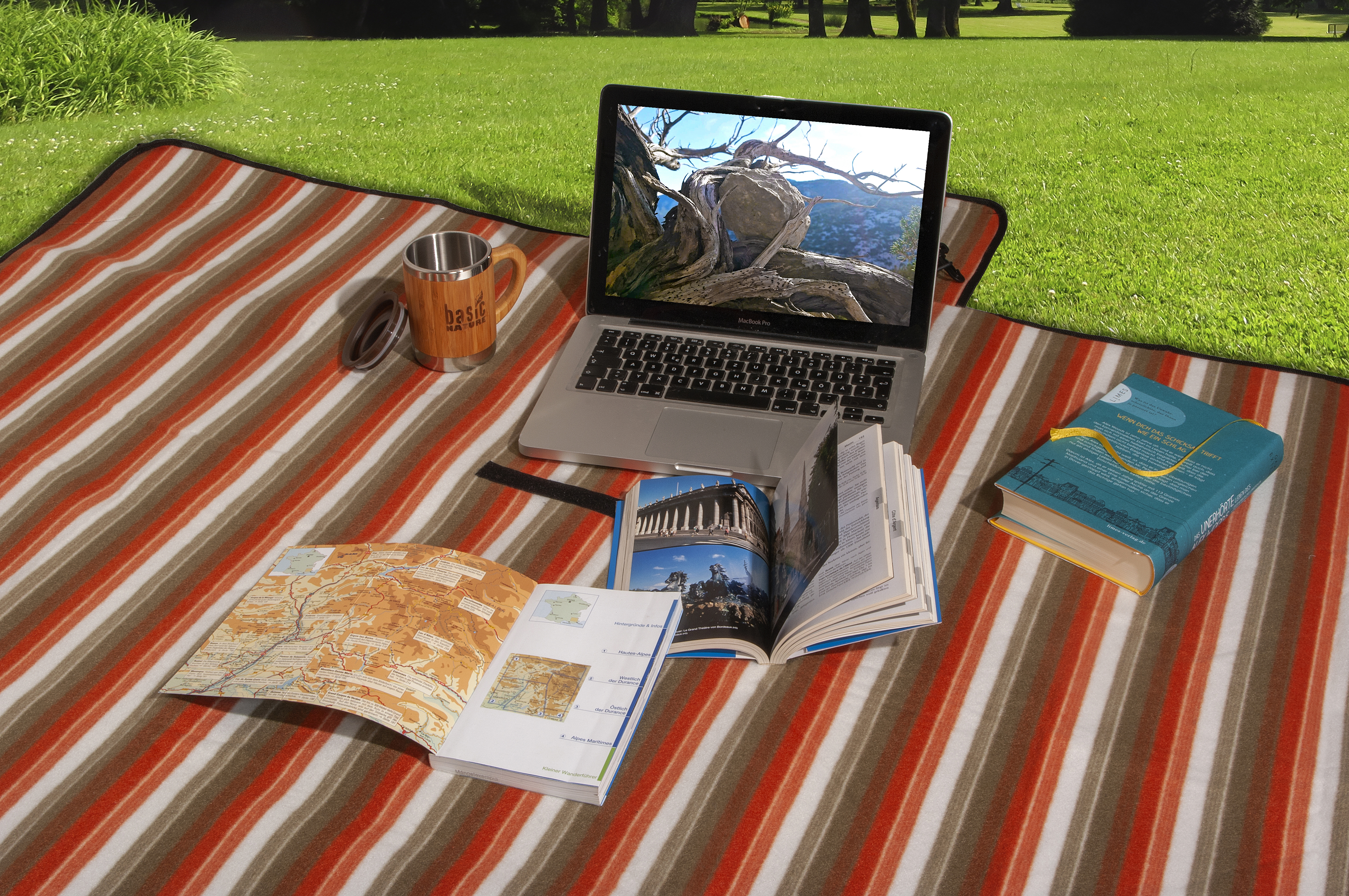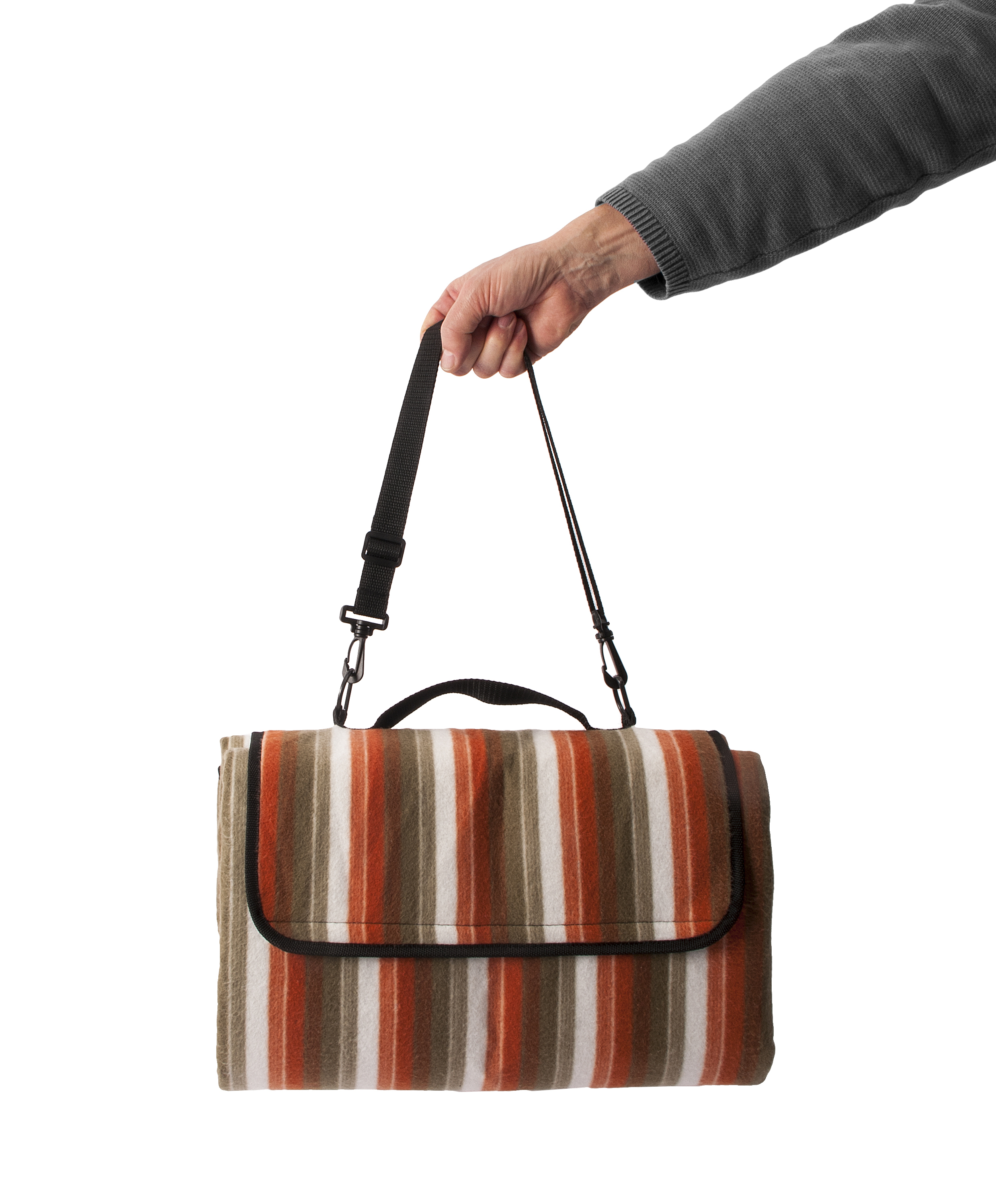 Universell einsetzbare Picknickdecke mit vielen praktischen Spezialdetails. Die Oberseite aus Fleece ist angenehm auf der Haut und strapazierfähig. Die Mittellage aus PU-Schaum isoliert und gibt der Decke eine gute Haptik. Die Unterseite aus EVA ist wasserfest und sehr stabil. Alle drei Lagen sind fest miteinander verbunden. Die Ecken sind verstärkt ausgeführt und mit jeweils einer offenen Tasche aus Nylon (30 x 30 cm) ausgestattet. Darin können Steine, Sand oder auch ein Buch die Decke beschweren und sicher am Platz halten. Die Taschen können aber auch einfach untergeschlagen werden oder für die Aufnahme von Zeitschriften oder Kleinmaterial dienen. An den Ecken und in der Mitte der langen Seiten findet man Schlaufen. Damit kann die Decke abgespannt (Heringe sind nicht enthalten) oder sogar notfalls auch als Tarp aufgespannt werden. Zusammengefaltet wird die Decke klein und praktisch mit dem verstellbaren Tragegurt und 2 Karabinern transportiert.