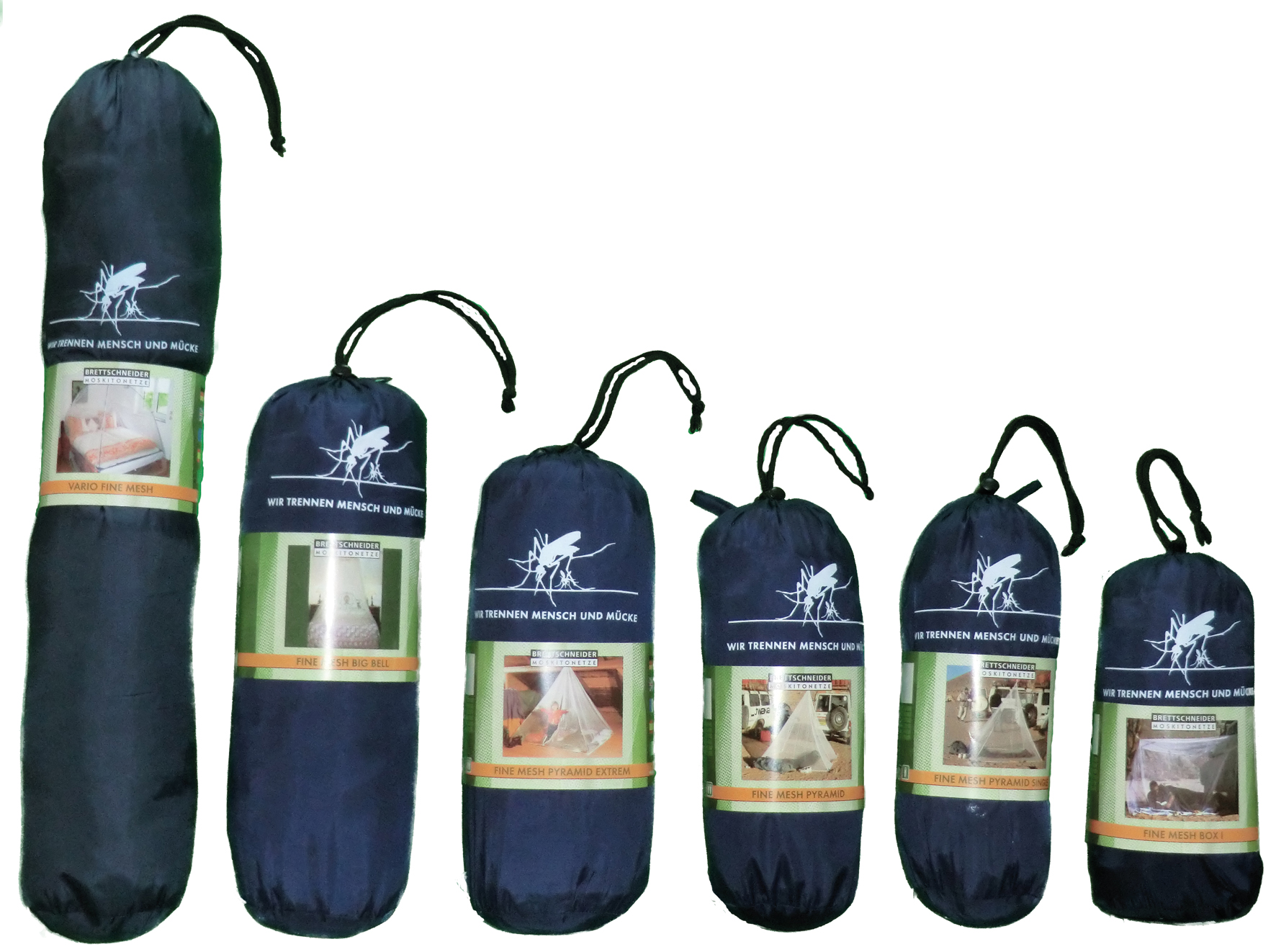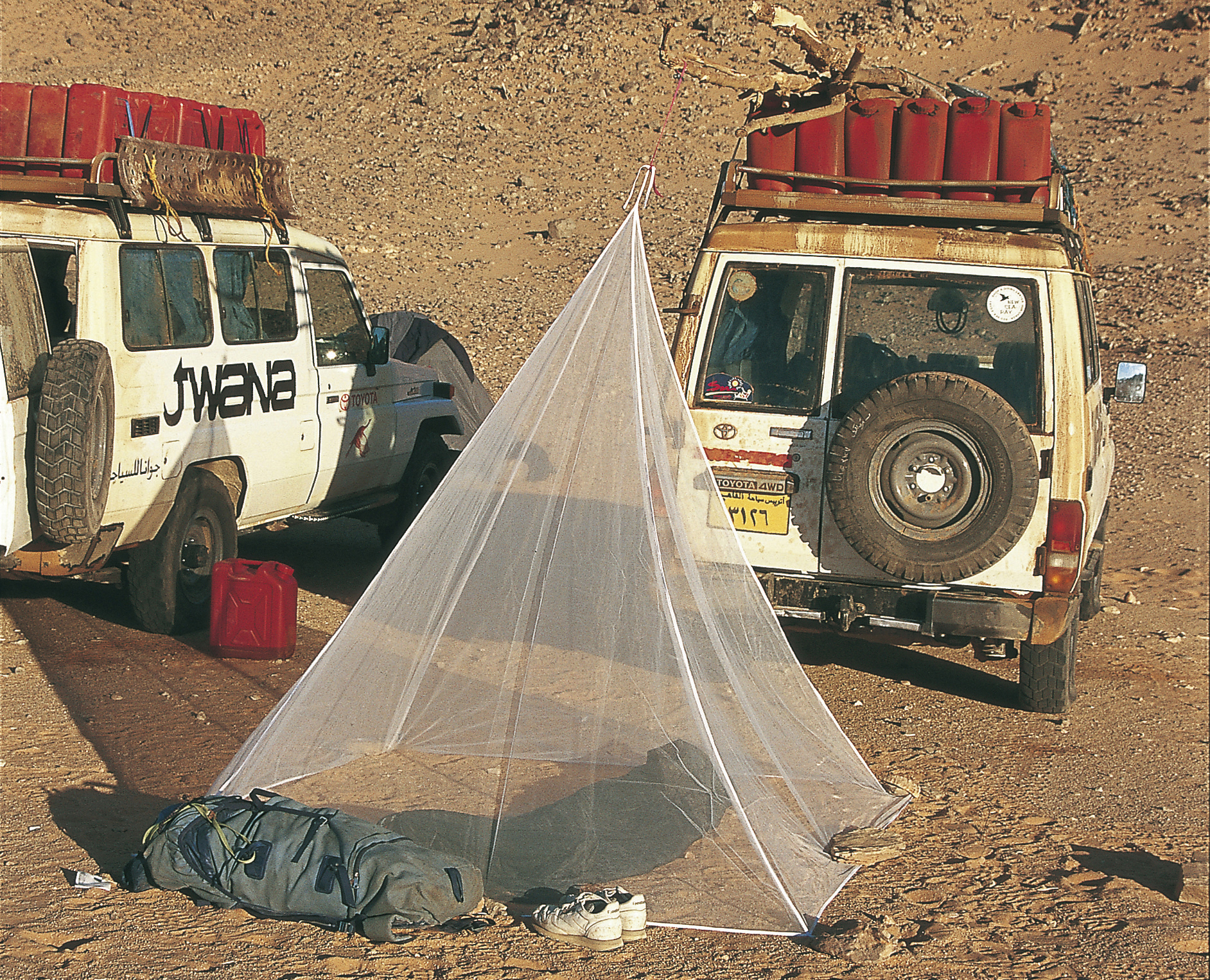 Baldachinförmiges Netz aus feinstem und besonders leichtem Polyamid. Liegt auf dem Bett auf. Sehr kleines Packmaß. Befestigung durch Schlaufen an der oberen Pyramidenspitze und an den unteren Ecken helfen diese beim Abdichten des Netzes um die Matratze.