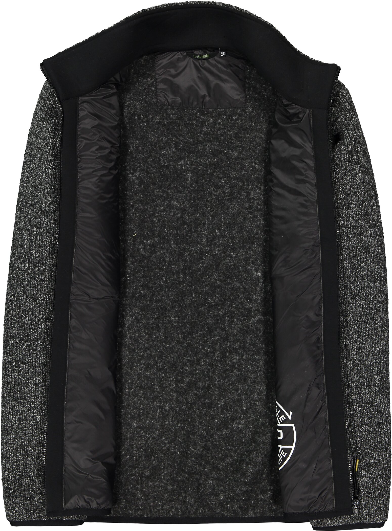 Fleece aus recyceltem Polyester, einer der nachhaltigsten Textilfasern trotz ihres synthetischen Ursprungs. Diese atmungsaktive Faser, die durch die Rückgewinnung und Wiederverwendung von Abfällen und Schrott hergestellt wird, reduziert die Treibhausgasemissionen und die Abhängigkeit von Erdöl als Rohstoff.
