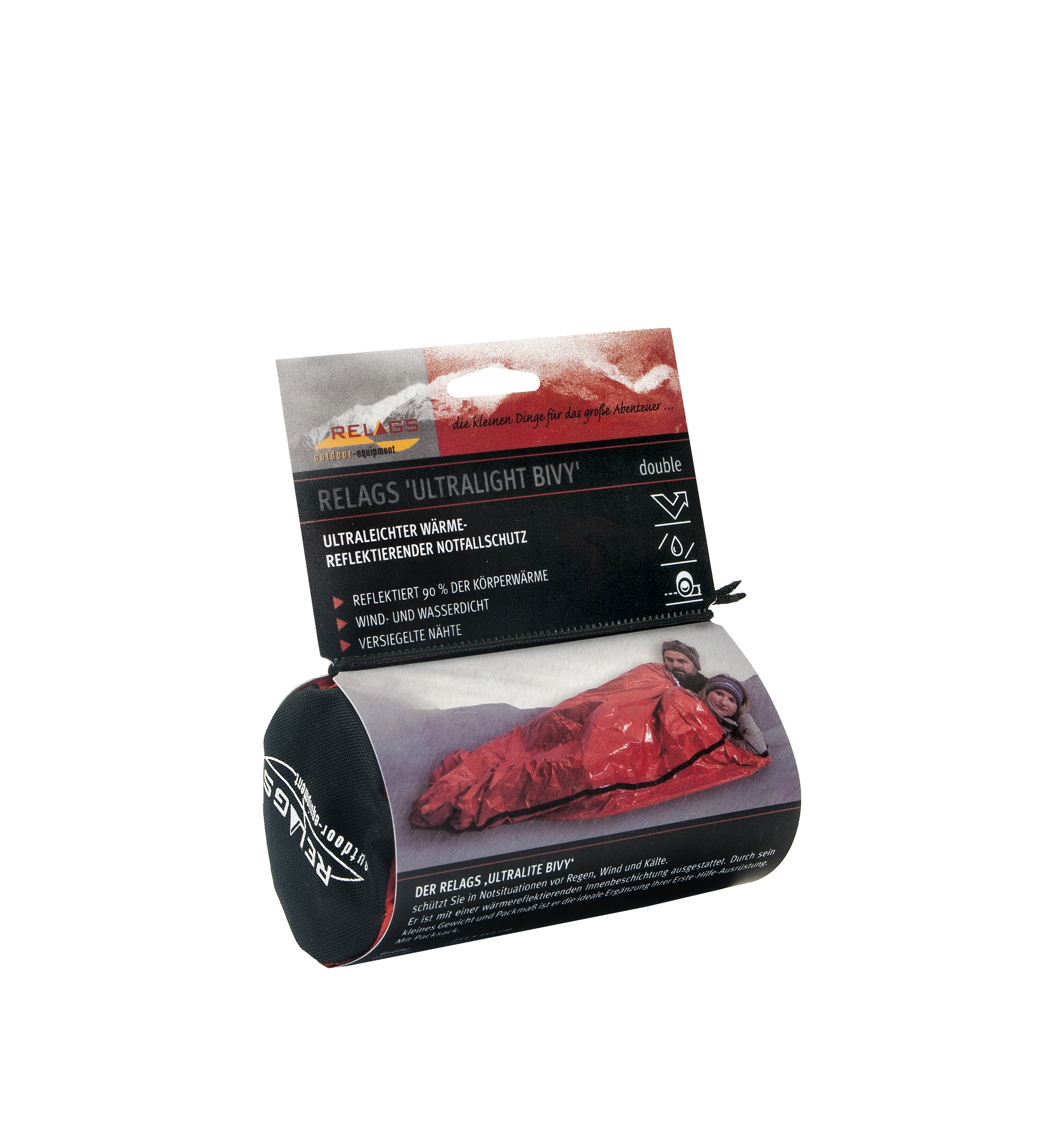Die wind- und wasserdichte Folie reflektiert 90 % der Körperwärme. Sie ist stabiler als die Folie einer Rettungsdecke und durch die Sackform auch besser für ein Notbiwak geeignet. Der Ultralite Bivy sollte zu jedem Erste-Hilfe-Set gehören, um bei Bedarf entscheidende Hilfe zu bieten. Im Packsack aus Ripstop-Nylon hat noch etwas zusätzliche Notausrüstung - wie z. B. eine kleine Stirnlampe - Platz.