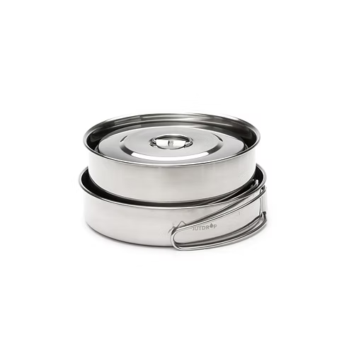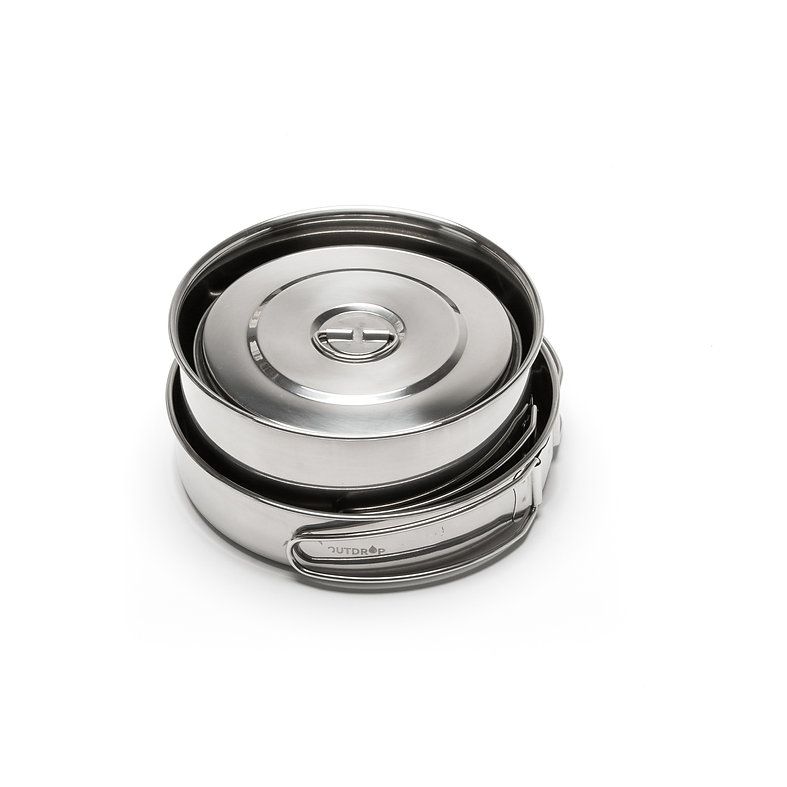 Einsteiger-Edelstahlset bestehend aus 1 x Pfanne mit Klappgriff, 1 x großer Topf mit Faltgriff (Pfannne fungiert als Deckel), 1 x kleiner Topf mit Faltgriff. Geschmacks- und geruchsneutral BPA Frei Maße Set: 158 mm x 158 mm x 75 mm Pfanne:158 mm x 158-260 mm (Griff) x 37 mm Großer Topf: 150 mm x 150-245 mm (Griff) x 70 mm Kleiner Topf: 120 mm x 120-210 mm (Griff) x 60 mm Fassungsvermögen Pfanne: 660 ml Großer Topf: 1000 ml Kleiner Topf: 630 ml Gewicht: Pfanne: 103 g Großer Topf: 131 g Kleiner Topf: 98 g + 42g = 140g