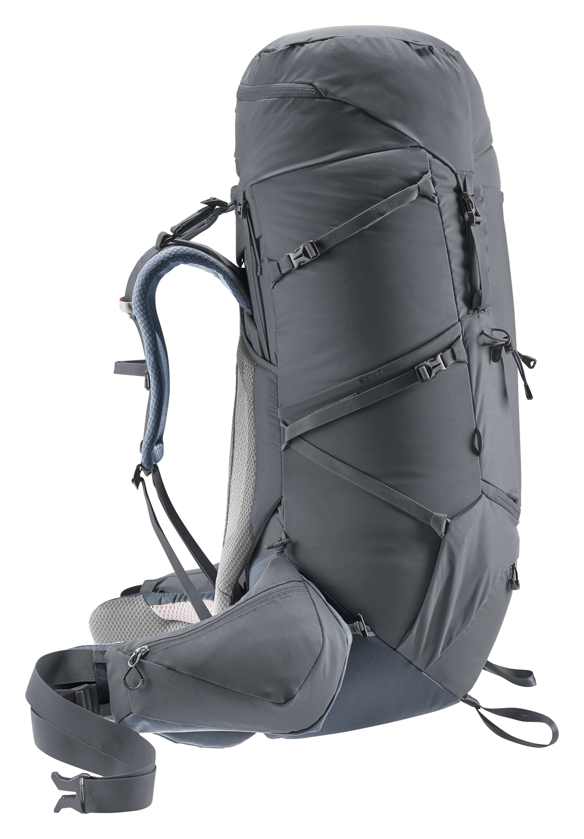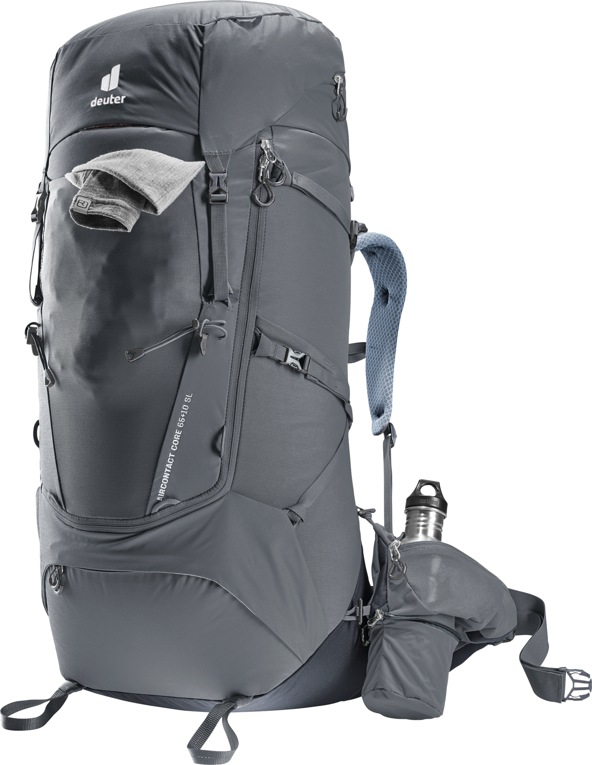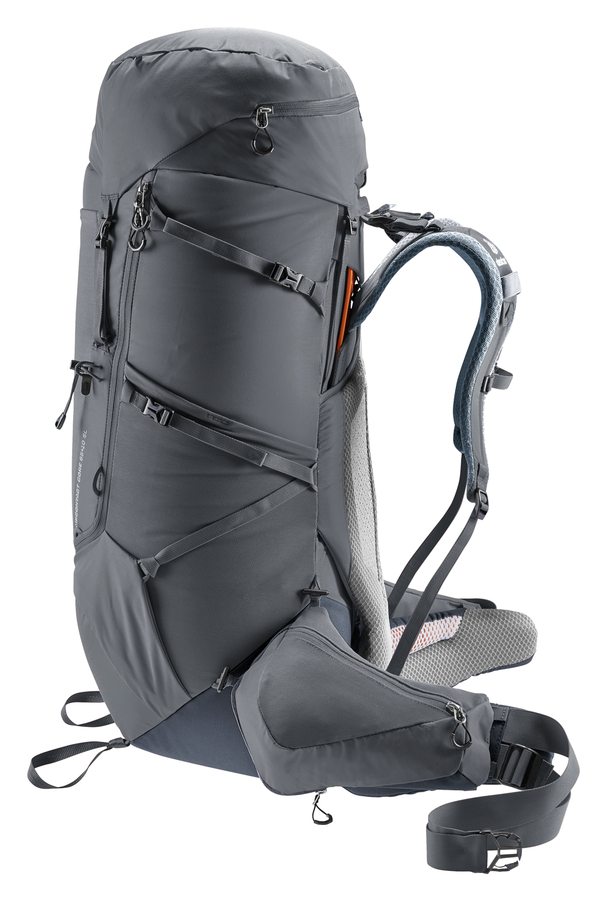 Für hohen Tragekomfort und optimale Lastverteilung sorgen das Aircontact-Rückensystem mit Air Spacer Mesh und großem Belüftungskanal, die bequemen Schulterträger, die beweglichen Hüftflossen und das ergonomische Lumbalpad. Eine große, J-förmige Frontöffnung gewährt mühelosen und schnellen Zugang auf den Rucksackinhalt. Zudem bieten die abnehmbaren 3 Liter Hüftflossentaschen mehr Volumen für persönliche Gegenstände. Und auch Trinkflaschen bis 1,5 Liter finden in einer ausklappbaren Tasche Platz.