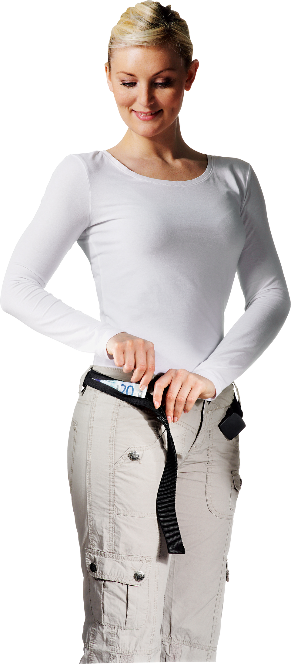 Das flexible Geheimfach wird am Gürtel befestigt und in die Hoseninnenseite geklappt. So können Geld und Wertsachen unsichtbar in der flexiblen Tasche transportiert werden.