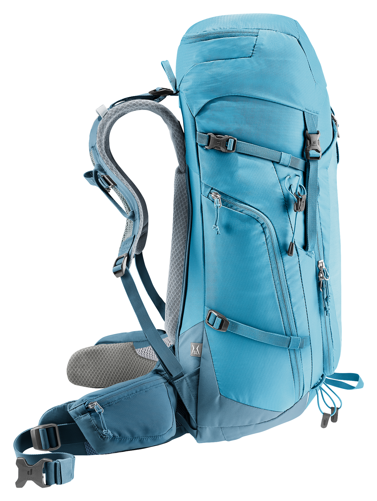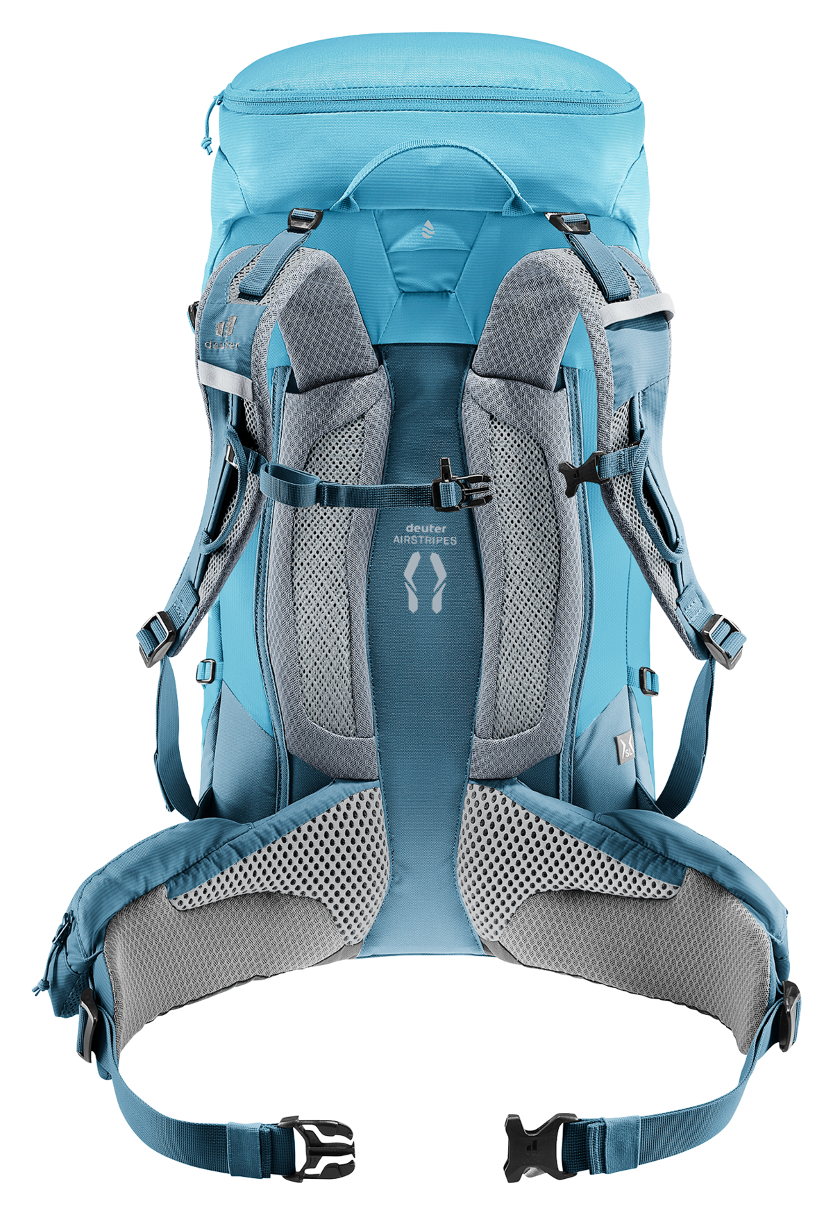 Das Airstripes Rückensystem mit geringer Auflagefläche und luftdurchlässigem, schnell trocknendem Air Spacer Mesh sorgt zusammen mit den perforierten Schulterträgern und Hüftflossen für maximale Belüftung, gute Lastverteilung und kompakten Sitz auf langen Touren mit Klettersteig. Die flache Deckelkonstruktion bietet gute Kopffreiheit - auch mit Helm. Dank Fixierungen an den Schulterträgern sind die Karabiner des Klettersteigsets stets griffbereit und das Material über den großen Reißverschluss-Frontzugang und Seitentaschen schnell erreichbar.