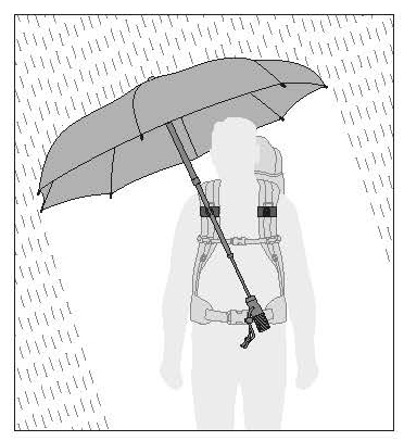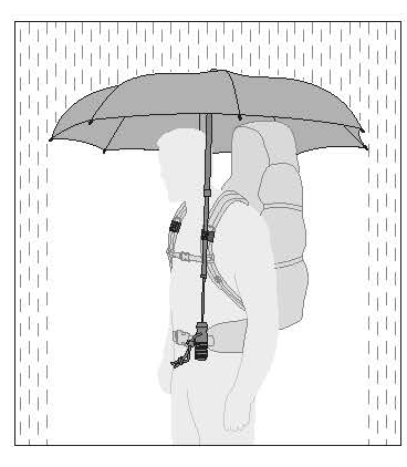 Modell der Sonderklasse: handfreier und teleskopierbarer Trekkingschirm. Der Schirm ist unkompliziert vorne am Rucksacktragesystem zu befestigen (Hüftgurt ist Voraussetzung!) und sowohl gerade, als auch geneigt (zur Windseite) zu tragen. Beide Hände bleiben frei, um z. B. mit Stöcken zu gehen, Karten zu lesen, den Hund zu dirigieren oder die Kinder zu führen. Der Schirmgriff kann mittels 2-facher Teleskopverstellung passend in der Länge eingestellt werden. Mit leichtem Fiberglasgestell und hauchdünner Bespannung aus 100 % Polyestergewebe mit Teflon®-Behandlung (eingetragene Marke von DuPont, die unter Lizenz von Eberhard Göbel GmbH & Co. genutzt wird), für den höchsten Abperleffekt. Natürlich ist der Schirm auch als 'normaler' Trekkingschirm zu nutzen. Komplett mit Befestigungsklipps und Trageköcher. In oliv optimal für Naturfreunde, Jäger, Fischer usw.