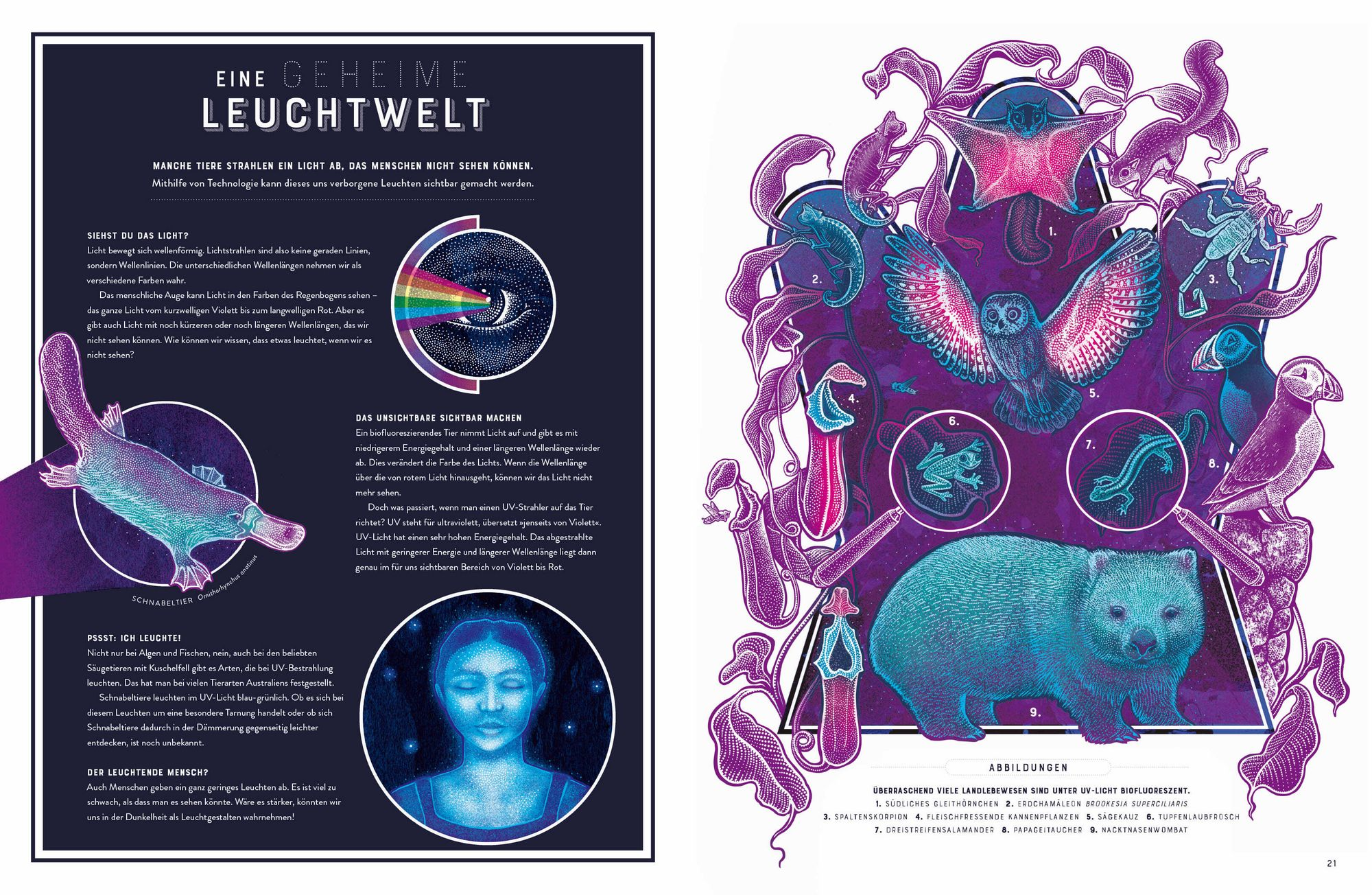 Wusstest du, dass manche Lebewesen eine geheime Superkraft haben? Sie können leuchten! Ob Vampirtintenfisch oder magischer Leuchtpilz – die Natur steckt voller Wunder und Überraschungen! »GLOW« erforscht, wie und warum manche Tiere und Pflanzen Licht erzeugen, und was wir von ihnen lernen können. Komm mit auf eine faszinierende Reise zu den erstaunlichsten Kreaturen der Tiefsee, entdecke verschlungene Höhlennetzwerke, die dunkelsten Ecken des Waldes und erlebe das wundersame Leuchten der Natur. Das erste Kindersachbuch zum spannenden Naturphänomen der Biolumineszenz – ein Buch von funkelnder Schönheit im supergroßen Format mit auffälligem Cover