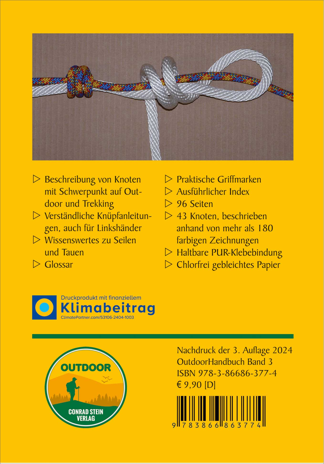 Die Situationen sind vielfältig und allen Liebhabern des Freiluftlebens hinlänglich bekannt: Eine Wäscheleine soll zwischen zwei Baumstämmen gespannt werden, das überstehende Ende ist nur noch kurz – wie bekomme ich die Leine am besten fest? Das Kanu muss beim Lagern an einem schnell strömenden Fluss sicher vertäut werden – auf welchen Knoten kann ich mich verlassen? Ob Sie Ihr Zubehör außen am Rucksack sicher anbringen wollen, ob eine Zeltleine gerissen ist, die Nahrungsmittel hoch in den Baum gehängt werden müssen, immer wieder gibt es beim Leben in freier Natur Situationen, in denen das obligate Stück Bindfaden in der Tasche allein nicht ausreicht – ein guter Knoten gehört dazu. Die Autoren stellen 43 besonders nützliche vor. Neben Basisknoten wie Palstek oder Webeleinenstek, die jeder Outdoorer beherrschen sollte, werden auch weniger bekannte Knoten und Varianten gezeigt und erklärt, für welche Situationen sie sich besonders gut eignen. 180 farbige Illustrationen helfen beim Nachknoten. Eine Besonderheit dieses Buches: Zusätzliche Zeichnungen für Linkshänder erleichtern diesen, die Knüpftechnik ebenfalls nachzuvollziehen. Für die Gentleman-Outdoorer sind drei Krawattenknoten hinzugefügt.