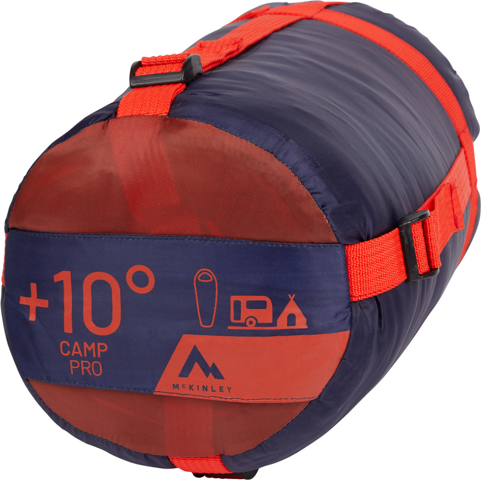 Der Schlafsack Camp Pro 10 von McKINLEY ist das ideale Modell für etwas kühlere, aber nicht allzu kalte Nächte in der wärmeren Jahreshälfte. Mit einem Packmaß von ca. 34 × 20 cm lässt er sich optimal am Rucksack transportieren. Ausgerollt betragen die Abmessungen 220 × 80 cm und der Schlafsack ist für eine maximale Körpergröße von ca. 195 cm ausgelegt. Hinsichtlich des Temperaturbereichs bietet der Schlafsack eine Komfortzone von +11 °C, einen Grenzbereich von +10 °C und einen Extrembereich von -8 °C. Das Füllgewicht beträgt ca. 570 g, das Gesamtgewicht des Schlafsacks ca. 970 g.