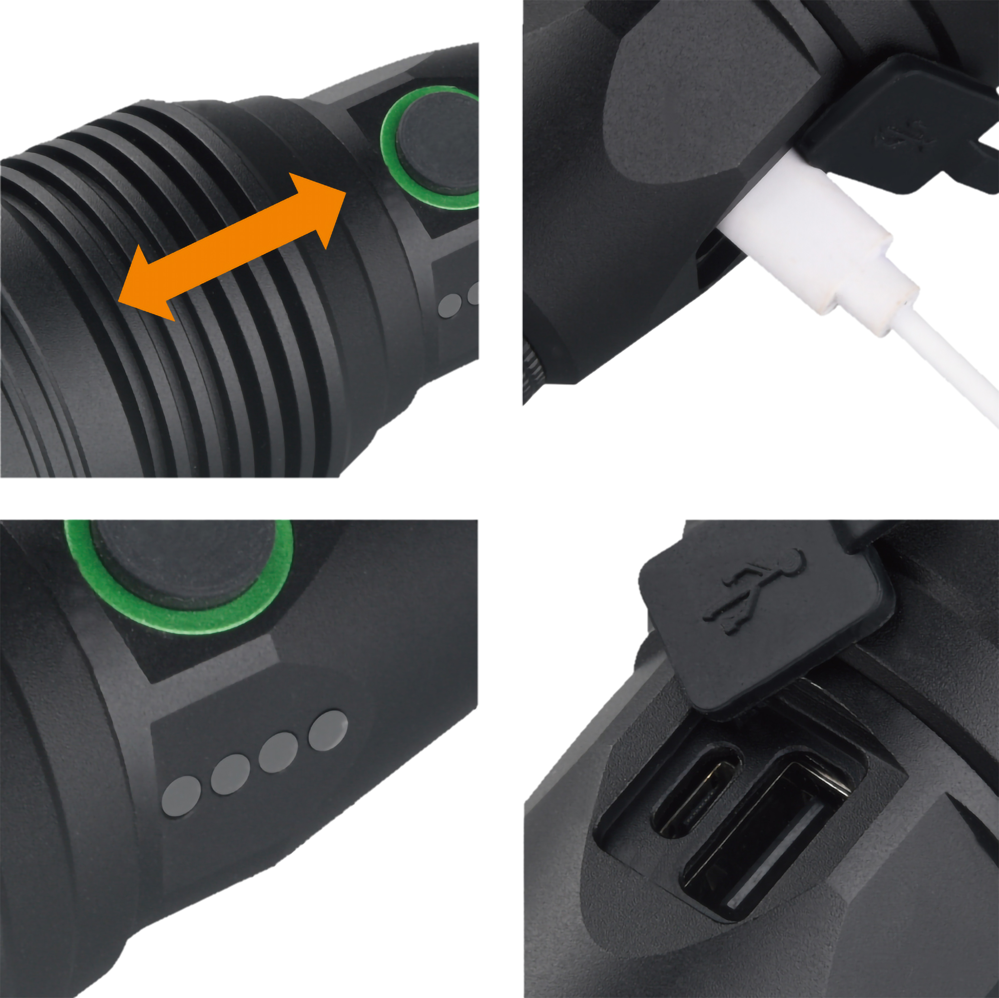 Extrem helle LED-Taschenlampe mit 6000 Lumen und Powerbankfunktion. Die Lampe ist nach IPX 4 spritzwassergeschützt und verfügt über 3 Leuchtstufen. Durch das stufenlose Verschieben des Lampenkopfes kann der Lichtkegel entweder auf eine kleine Fläche fokussiert oder auf eine große Fläche verteilt werden. Die Powerbankfunktion ermöglicht das Laden elektronischer Geräte unterwegs wie das Handy oder die Kamera. Die beiden mitgelieferten 18650 Lithium-Ionen Akkus können bequem über den USB-Anschluss an der Lampe aufgeladen werden. Die Akkus und ein 50 cm langes USB Typ-C Ladekabel sind im Lieferumfang enthalten.