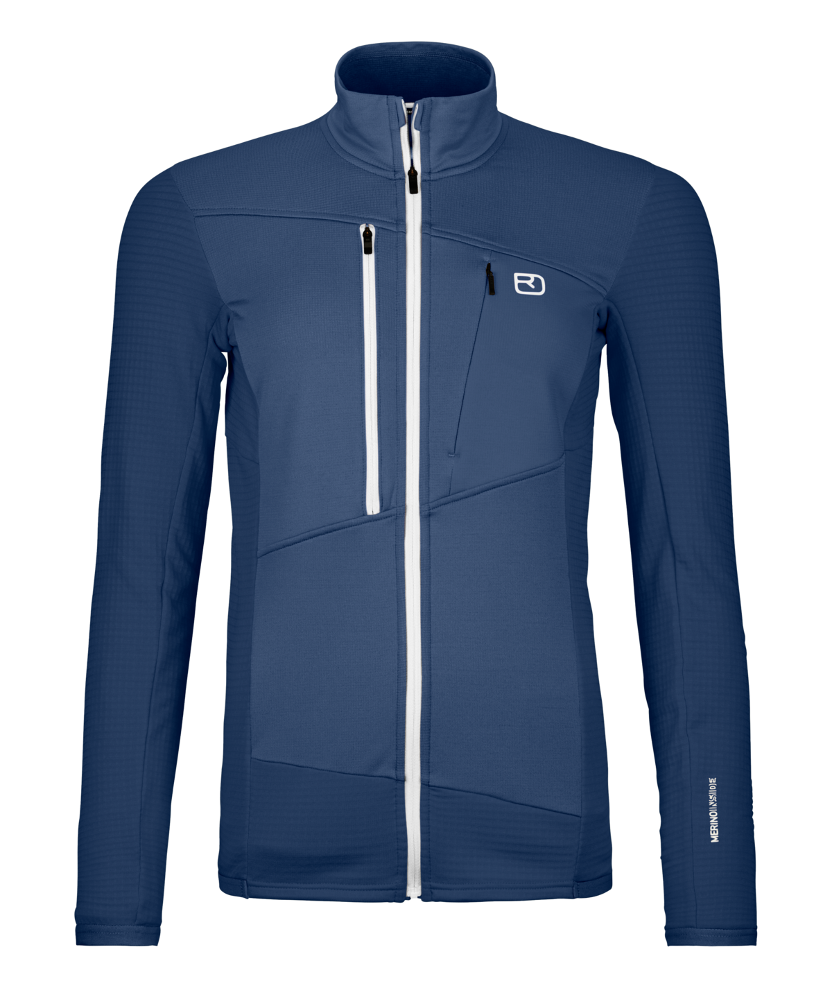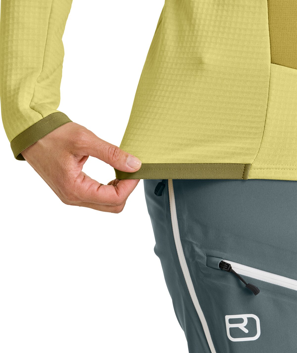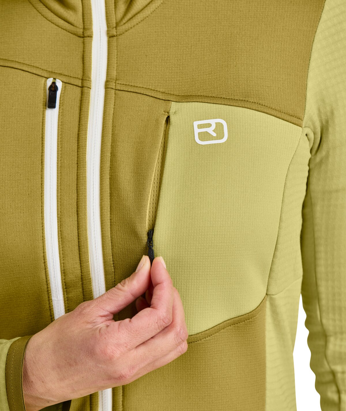 So vielseitig wie der Berg: Dank cleverem Materialmix bietet die FLEECE GRID JACKET für Damen auf anspruchsvollen Touren angenehme Wärme bei gleichzeitig guter Belüftung. Das MERINO FLEECE GRID Material bindet in seiner feinen Waffelstruktur warme Luft auf der Innenseite und gibt Feuchtigkeit nach außen ab, sodass die Jacke einerseits angenehm wärmt, andererseits aber auch schnell trocknet und äußerst atmungsaktiv ist. Die angenehm weiche Merinowolle auf der Haut sorgt für eine optimale Klimaregulierung und wirkt gleichzeitig geruchshemmend. An exponierten Stellen wie Brust, Schultern und Kopf schützen Einsätze aus elastischem und atmungsaktiven MERINO FLEECE LIGHT vor Wind und Kälte. Zwei rucksackkompatible Brusttaschen bieten Platz für Kartenmaterial, Handy oder Riegel. Dank des hohen Stretchvermögens und des großzügigen Schnitts im Schulterbereich bietet die Jacke optimale Bewegungsfreiheit und macht als alpiner Allrounder jedes Abenteuer mit.