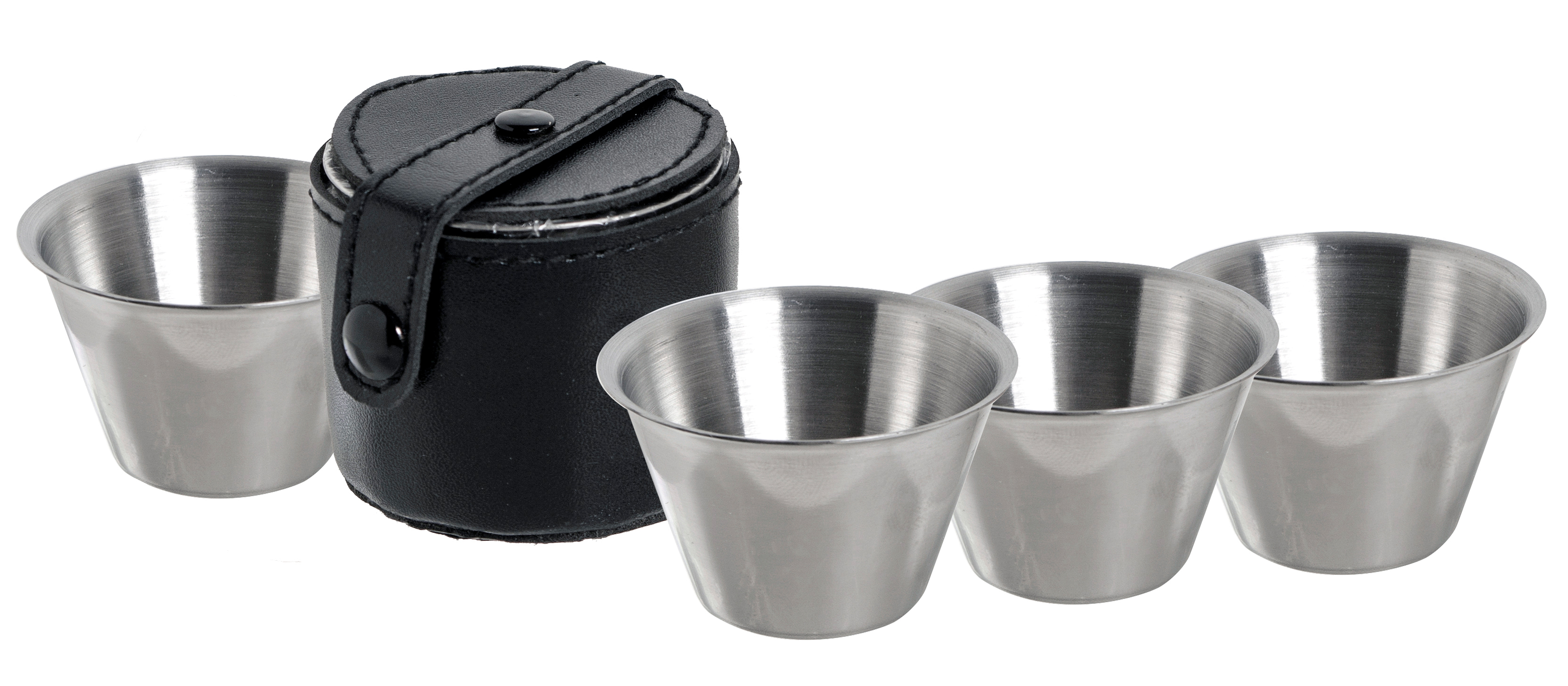 Vier kleine Edelstahlbecher in einem Etui mit Lederoptik. Ob bei der Skitour oder nach einem zünftigen Gipfelsieg - damit kann man auch unterwegs mal jemanden einladen. Ca. 30 ml pro Becher.