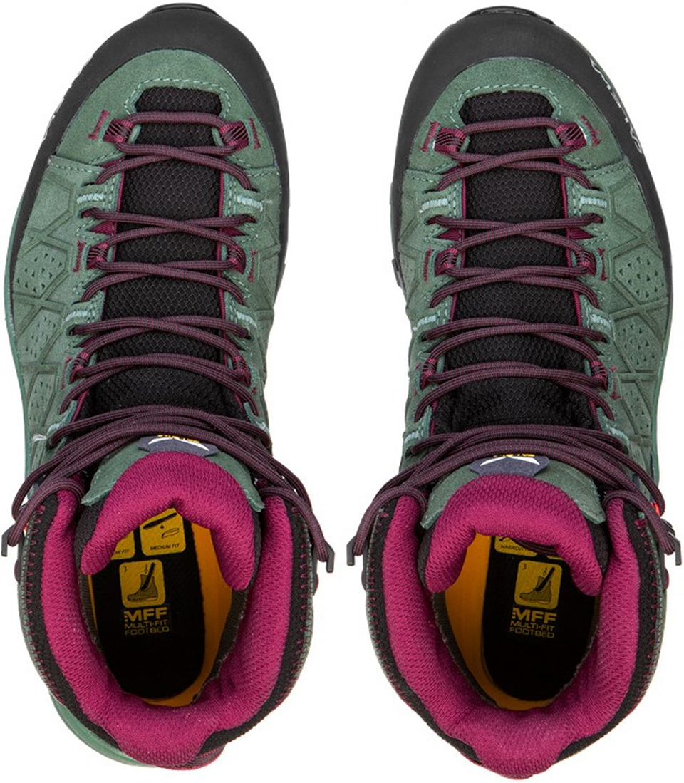 Zuverlässiger Schutz Der Alp Trainer 2 ist ein moderner Wanderschuh mit halbhohem Schaft, der dich bei weiten Wanderungen auf rauem Gelände zuverlässig schützt. Er hat ein robustes, hochwertiges Veloursleder-Obermaterial mit strapazierfähigen Stretcheinsätzen an der Zunge und ein wasserdichtes, atmungsaktives GORE-TEX® Extended Comfort Futter. Der großzügige Gummirand bietet zusätzlichen Schutz vor Felskanten und Geröll. Tragekomfort und Halt Der Schuh wurde speziell für Damen entwickelt, um die besondere Form des weiblichen Fußes zu berücksichtigen. Er hat eine präzise Passform, gibt deinem Fuß Halt und ist gleich beim ersten Anziehen bequem. Unser patentiertes 3F System sorgt für festen Halt am Knöchel und seitliche Stabilität auf rauem Terrain, während der weiche Flex Collar dem Knöchel mehr Bewegungsfreiraum gibt und bergab den Tragekomfort erhöht. Mit dem anpassbaren SALEWA® Multi Fit Footbed Plus (MFF+) kannst du zwischen verschiedenen Einlagen wählen und so das Schuhvolumen auf dich abstimmen. Das Kletterschuh-Schnürsystem ermöglicht außerdem ein individuelles Festziehen bis zu den Zehen. Griffigkeit und Kontrolle Die optimierte Vibram® Alpine Hiking Außensohle, die nur von SALEWA® angeboten wird, verbessert die Leistung und Kontrolle auf ganz unterschiedlichem Gebirgsterrain. Durch ihre speziellen Kletter-, Haftungs- und Bremszonen überzeugt sie zudem auch unter nassen und schlammigen Bedingungen. Der Alp Trainer 2 ist ein leichter, bequemer und zuverlässiger Schuh – eine exzellente Wahl für alpine Wanderungen jeder Art.