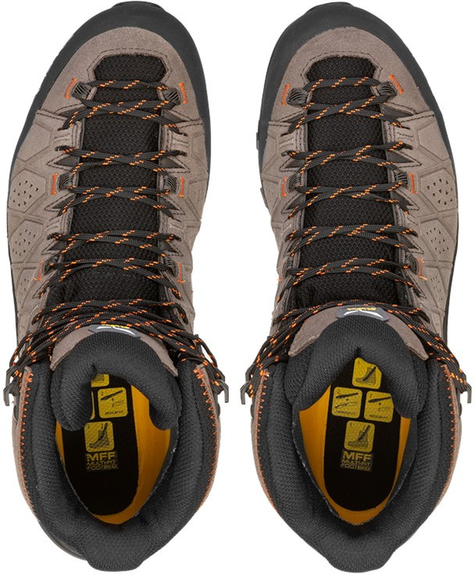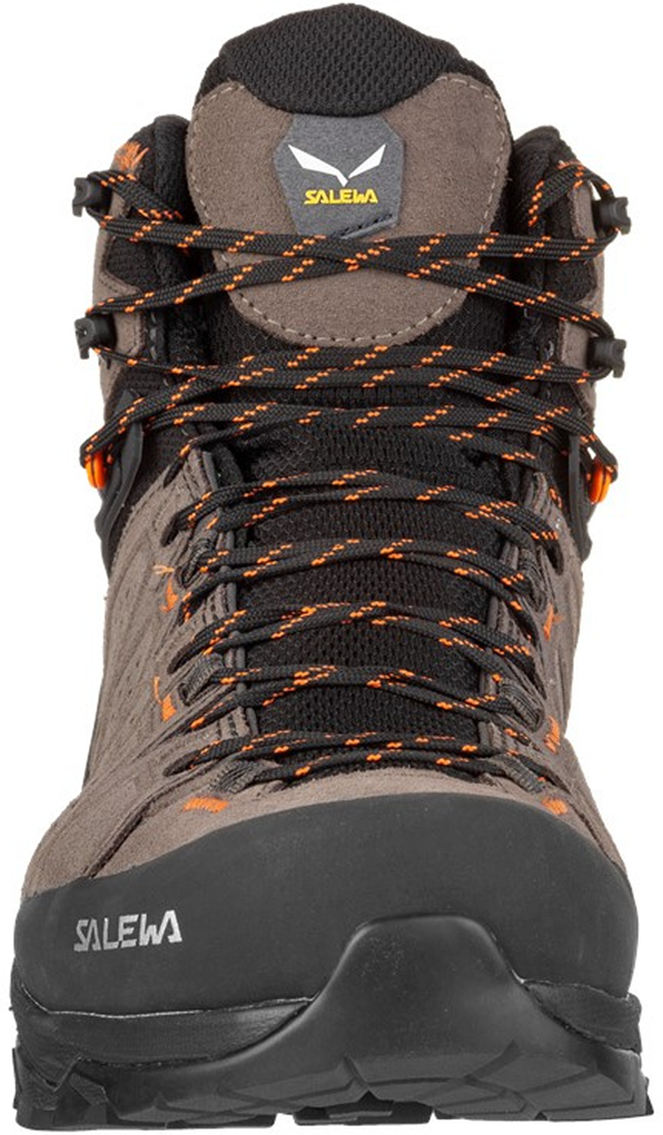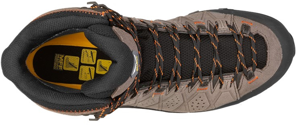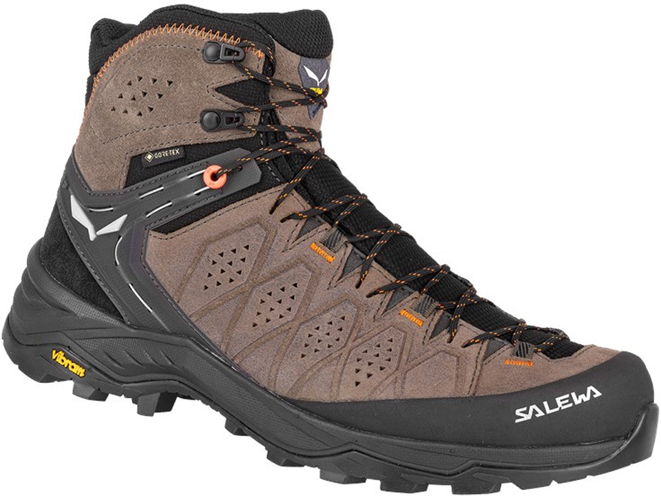 Zuverlässiger Schutz Der Alp Trainer 2 ist ein progressiver Wanderschuh mit halbhohem Schaft, einem robusten, hochwertigen Veloursleder- und Stretch-Obermaterial und einem wasserdichten, atmungsaktiven GORE-TEX® Extended Comfort Futter, das dich auf verschiedenem Terrain und bei wechselhaften Bedingungen zuverlässig schützt. Ein großzügiger Gummirand bietet zusätzlichen Schutz vor Felskanten und Geröll. Anpassungsfähig und bequem Der Schuh bietet eine präzise Passform, umschließt deinen Fuß sicher, gibt ihm Halt und ist gleich beim ersten Anziehen bequem. Unser eigenentwickeltes, patentiertes 3F System enthält ein Stahlseil und sorgt für festen Halt am Knöchel sowie seitliche Stabilität, während der Flex Collar dem Knöchel mehr Bewegungsfreiraum nach hinten gibt und den Tragekomfort beim Abstieg erhöht. Darüber hinaus kannst du mit dem anpassbaren SALEWA® Multi Fit Footbed Plus (MFF+) zwischen verschiedenen Einlagen wählen und so das Schuhvolumen auf dich abstimmen. Das Kletterschuh-Schnürsystem ermöglicht außerdem ein individuelles Festziehen bis zu den Zehen – für eine bessere Leistung auf technischem Gelände. Verbesserte Griffigkeit und Haftung Die optimierte Vibram® Alpine Hiking Außensohle, die nur von SALEWA® angeboten wird, verbessert die Leistung und Kontrolle auf ganz unterschiedlichem Gebirgsterrain. Durch ihre speziellen Kletter-, Haftungs- und Bremszonen und das aggressive Stollendesign überzeugt sie auch unter nassen und schlammigen Bedingungen. Der Alp Trainer 2 ist ein leichter, beweglicher und bequemer Schuh – eine exzellente Wahl für Wanderungen im Hochgebirge.