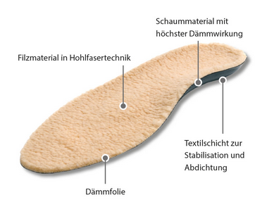 Das extrem wärmende Obermaterial besteht aus Hohlfasern und hat durch diese Eigenschaft eine sehr hohe Dämmwirkung. Das heißt: Es hält die Wärme im Schuh. Das Innenleben der Einlage besteht aus einem Weichschaum mit guten Dämpfungs- und Wärmeeigenschaften. Das Fußbett führt den Fuß und gibt ihm Stabilität, die das Umknicken verhindert.