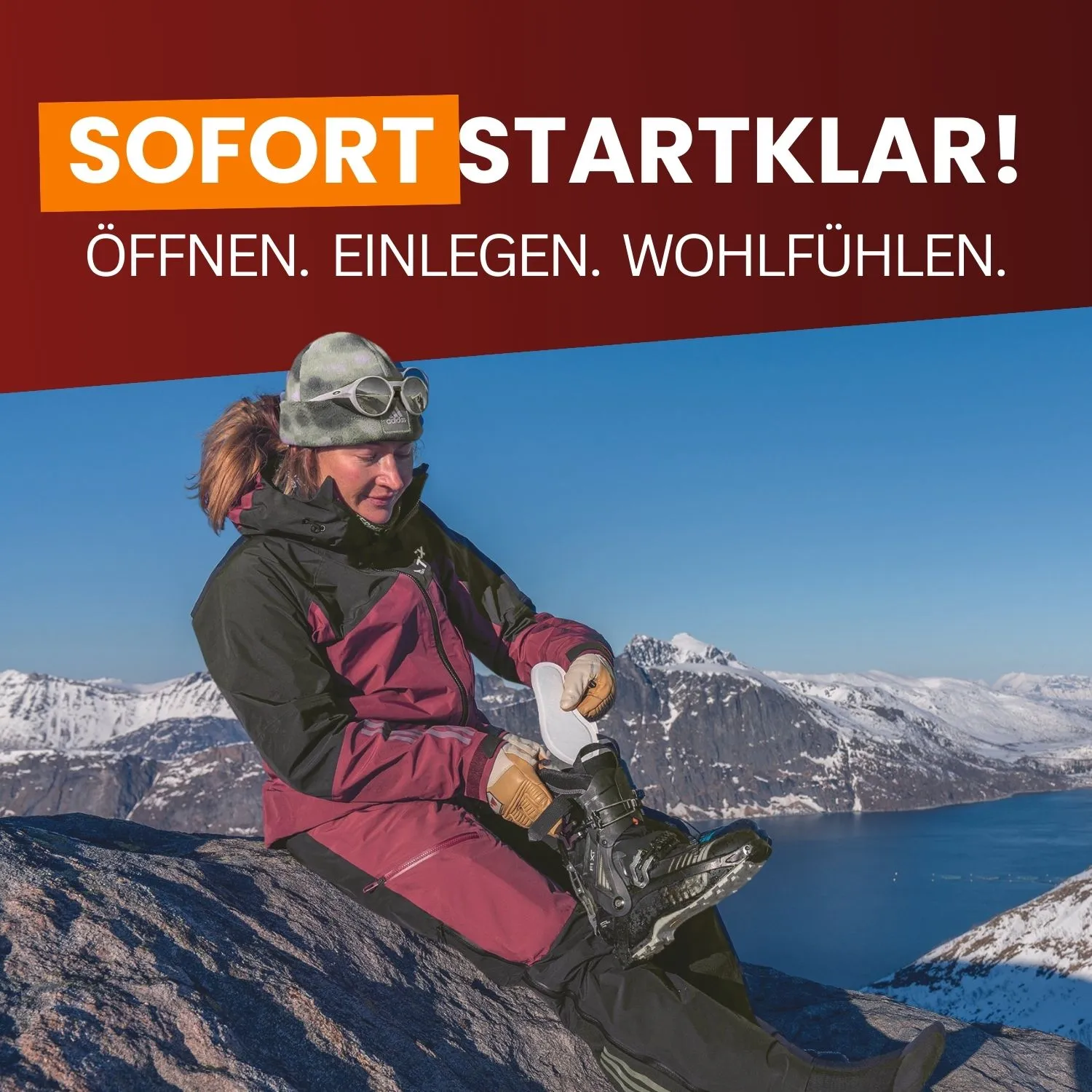 Die luftaktivierten Sohlenwärmer (Einlegesohle) erwärmen sich nach Entfernen der Verpackung automatisch. Gelten als Top-Produkt beim Skifahren oder im Stadion, finden aber auch im Alltag viele Anwender. Die Wärmesohlen passen in jeden (Ski)Schuh. Wärmer nach dem Öffnen direkt in die Schuhe und diese anziehen. So entwickeln sie eine durchschnittliche Temperatur von ca. 37°C für bis zu 9 Stunden