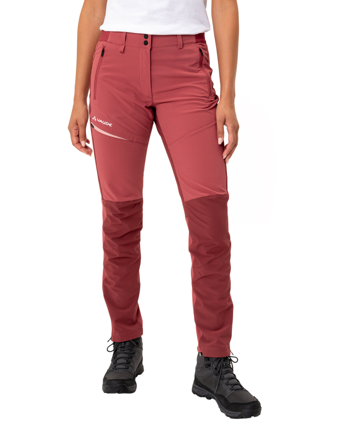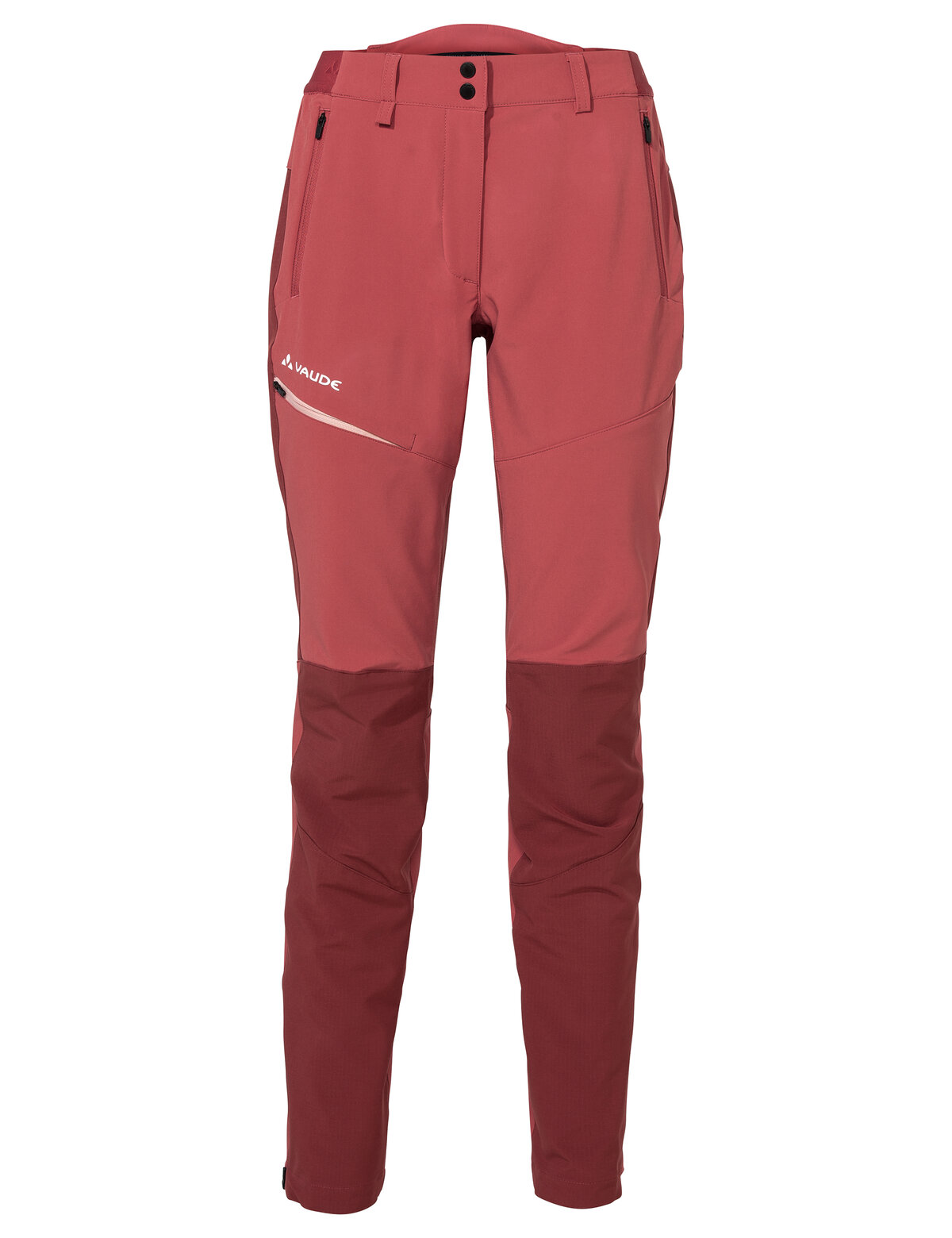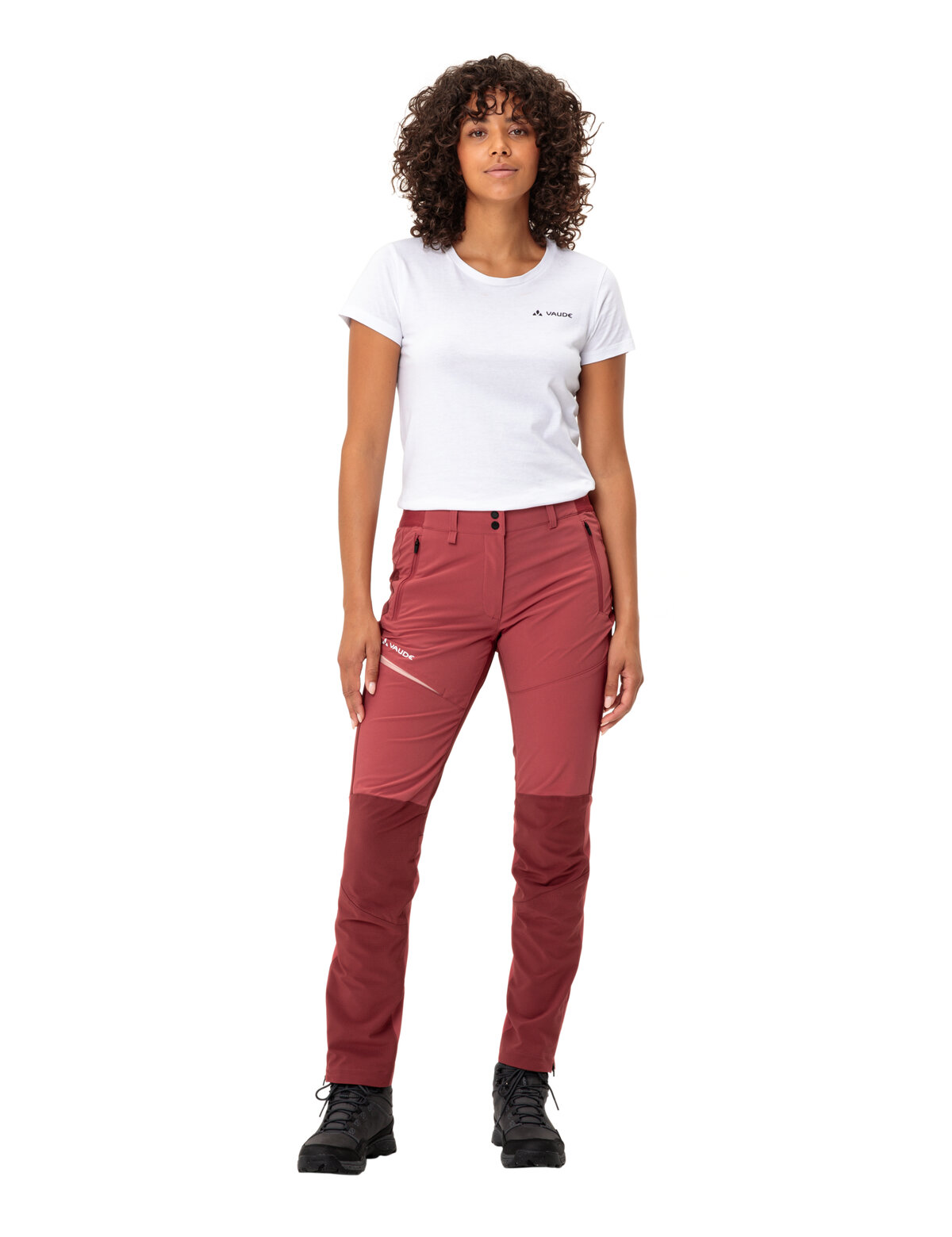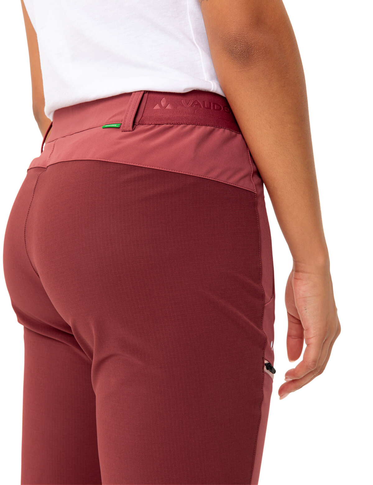 Eine Hose, die perfekt sitzt und nirgendwo zwickt: Die sportliche Elope Outdoorhose für Damen passt sich mit ihrem hohen Elasthan-Anteil, den ergonomisch vorgeformten Knien und dem schmalen, körpernahen Schnitt jeder Figur an und bietet so optimale Bewegungsfreiheit auf Wander- und Trekkingtouren. Der Bund mit elastischen Einsätzen hält die Hose bei allen Outdooraktivitäten perfekt am Platz. Soll sie dennoch fester am Körper sitzen, bieten Schlaufen die Möglichkeit, zusätzlich einen Gürtel zu tragen. Das Material ist äußerst strapazierfähig, hält Wind und leichte Regenschauer ab und weist einen UPF-Wert von 50+ auf. Diese Outdoorhose für Damen ist pflegeleicht und trocknet in kürzester Zeit, sodass sie auf mehrtägigen Touren auch zwischendurch schnell von Hand ausgewaschen werden kann. Eine Beintasche sowie zwei Fronttaschen bieten Platz für Handy, Schlüssel, Geldbeutel oder andere wichtige Gegenstände. Die Saumweite kann mit einem Reißverschluss reguliert werden. Die Elope Damen Outdoorhose besteht überwiegend aus recyceltem Polyester und ist mit Eco Finish PFC-frei wasser- und schmutzabweisend ausgerüstet. Das VAUDE Green Shape-Label steht für ein umweltfreundliches, funktionelles Produkt aus nachhaltigen, bluesign® zertifizierten Materialien.